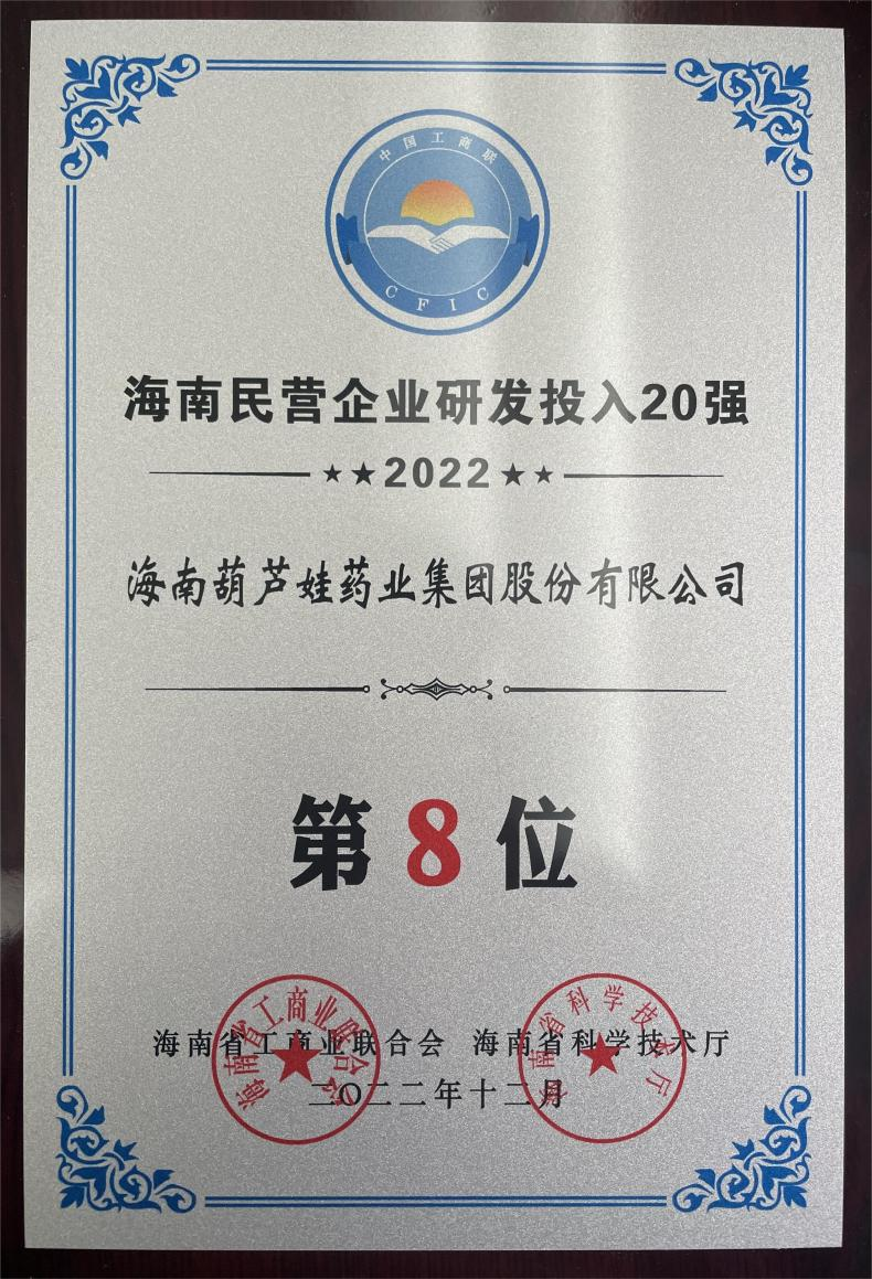 12月23日,2022海南民营企业50强和研发投入20强发布会在海口举行。会上发布了“2022海南民营企业50强”“2022海南民营企业研发投入20强”榜单和分析报告。快盈VIII药业再次荣登两榜,在海南民营企业50强榜单中位列第25位,较去年上升8位,这也是公司连续三年登榜;在海南民营企业研发投入20强中位列第8位,较去年上升7位。
